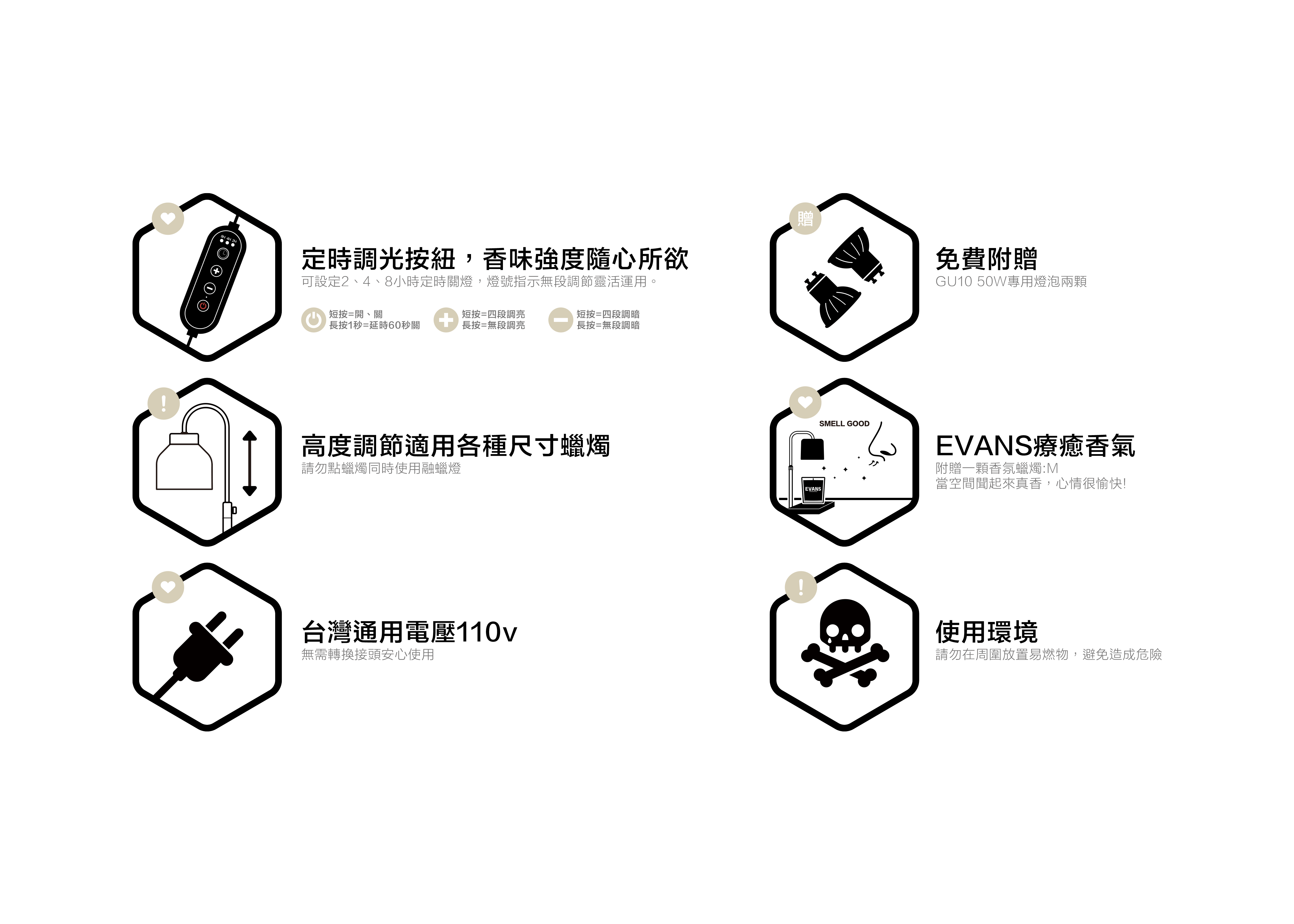 全新獨家融蠟燈,極簡黑白雙色搭配屬質感可升降款式,全新附加無段調節功能,定時調光燈的亮度,妝點家居美感最容易入手的高級融蠟燈,為了無法點火蠟燭的朋友,貼心定時器讓您可以悠悠享受香氣,不用害怕擔心忘記關,微光照下就能融化香氛蠟燭,濃淡依照喜好調整亮度,微微療癒光芒享受香氛時光,放鬆一下吧!
